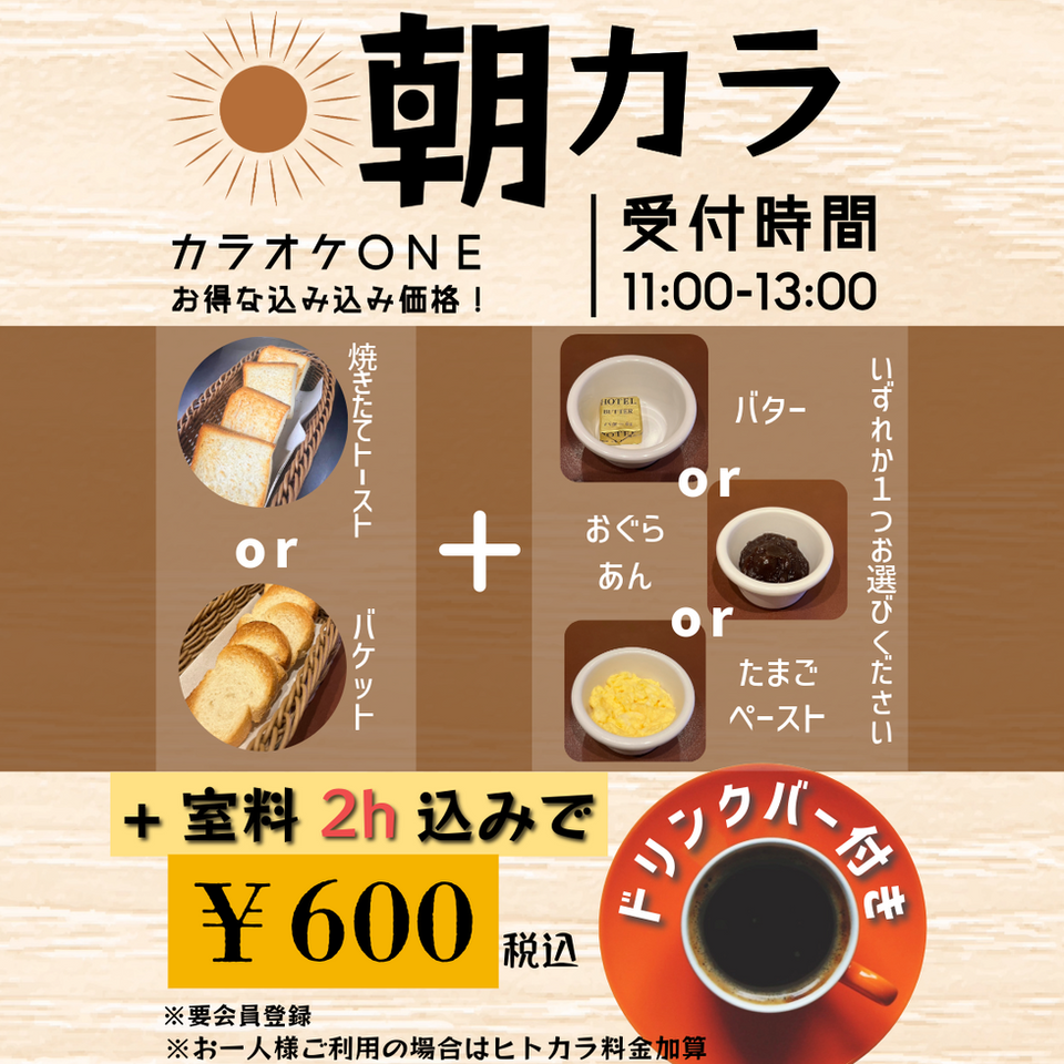 1人カラオケ料金:[時間利用]+200円/[フリータイム,パック料金]+350円